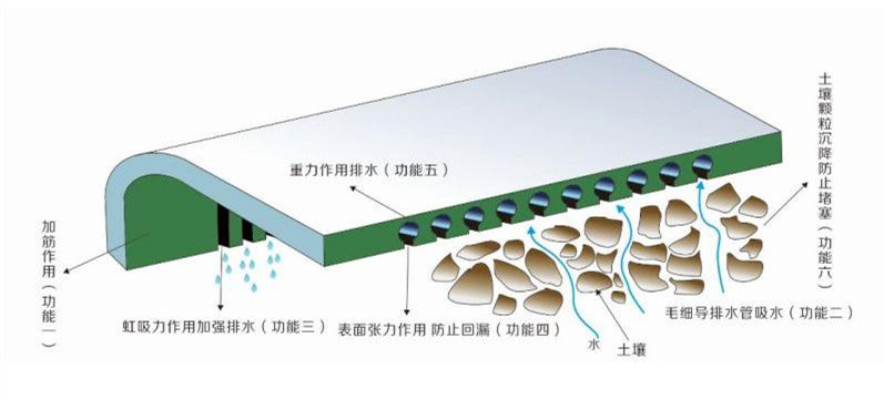 本產(chǎn)品采用PVC高密度聚合材料,具有較好的韌性,埋于土中可以起到拉結(jié)土壤的作用(功能一);且一反傳統(tǒng)改采用密集溝槽,內(nèi)大外小的設(shè)計(jì),且埋設(shè)時(shí)溝槽面向下,而使水流由下往上倒吸進(jìn)入毛細(xì)導(dǎo)水管(功能二);如此一來(lái)土壤顆粒因重力自然沉淀不致隨同水流進(jìn)入毛細(xì)導(dǎo)水管內(nèi),同時(shí)也不會(huì)在進(jìn)水槽溝附近產(chǎn)生淤積現(xiàn)象(功能三);但是內(nèi)部溝槽既能進(jìn)水,同時(shí)也造成漏水之后果,此時(shí)毛細(xì)防排水板則利用表面張力使水在溝槽上產(chǎn)生封閉效果不回漏(功能四);當(dāng)水進(jìn)入時(shí),毛細(xì)現(xiàn)象會(huì)自然而然對(duì)土壤中的水分產(chǎn)生抽吸的效果,直到灌滿(mǎn)并以重力流向外排放(功能五);當(dāng)水流到達(dá)出口將因落差產(chǎn)生虹吸作用,進(jìn)一步對(duì)土壤內(nèi)部產(chǎn)生負(fù)壓,大幅增加吸排水效果(功能六)。