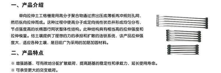 單向拉伸的土工格柵是由高分子聚合物經(jīng)擠出壓成薄板再?zèng)_規(guī)則孔網(wǎng),然后縱向拉伸而成。這種過(guò)程中使高分子成定向線性狀態(tài)并形成分布均勻、節(jié)點(diǎn)強(qiáng)度高的長(zhǎng) 橢圓形網(wǎng)狀整體性結(jié)構(gòu)。此種結(jié)構(gòu)具有相當(dāng)高的拉伸強(qiáng)度和拉伸模量,特別是我公司此類(lèi)產(chǎn)品更具有超國(guó)際水平的高早期(伸長(zhǎng)率在2%—5%)拉伸強(qiáng)度和拉伸模 量。給土壤提供了理想的力的承擔(dān)和擴(kuò)散的連鎖系統(tǒng)。該產(chǎn)品拉伸強(qiáng)度大(>150Mpa),適應(yīng)各種土壤,是目前廣為采用的加筋加固材料。